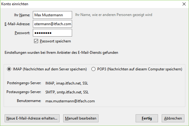 - Posteingangsserver imap.itfach.net / Port 993 / SSL und Postausgangsserver smtp.itfach.net / Port 465 / SSL